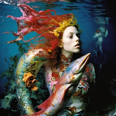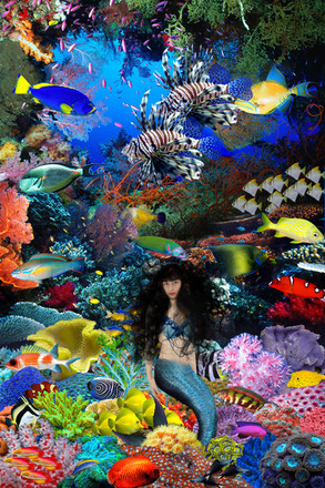 Ahhh look...a mermaid and Candystripe Angelfish. Which one is rarer and more expensive to house? :think: We may never know, but it's a lovely piece! I love the blue tone of the image. It seriously looks like we're underwater, along with that awesome hair effect. So floaty and lovely! Thank you again for this lovely gift, I love it SO much! I can't wait to show Mum, and tell her all about my rare little friend there. Bravo!