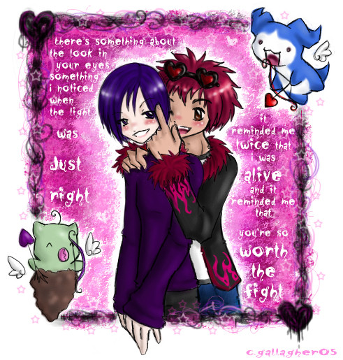 Yes. Oh my god this is adorable and gorgeous. ; ; They make such an amazing couple... They really mean a lot to me, because Meph is just this fucking HUGE peice of me. He's a part of me.. but at the same time he isn't. It's hard to explain. There are very few that actually feel like they're a SEPERATE entity from myself... Meph is one of them... oddly enough how he's just one of the biggest. It just feels like he resides inside of me... in my blood, under my skin... sleeping, waiting, raging, EXISTING.