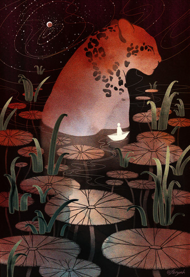 This is gorgeous; the foliage, the spiral of dots, the neat totemesque way you've put the designs on the trees, and of course the lady! Very striking, and the composition is very strong. I really like the frost on glass sort of texture in the sky in the top-left.