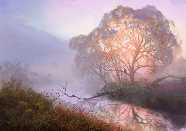 #blue #digital #illustration #krita #landscape #orange #painting #trees #water #gmic #art