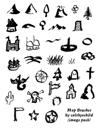 Three Photoshop CS2+ brush sets, which contain all the map icons. All of them are new sketch-style brushes, but can be used with my previous map brush sets.