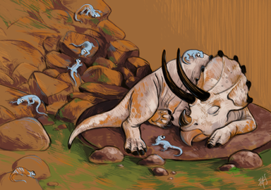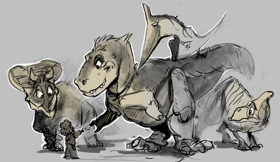 An old triceratops chief, humiliated and beaten up by a younger member of the herd, is left behind. A raptor scout finds the lying body.