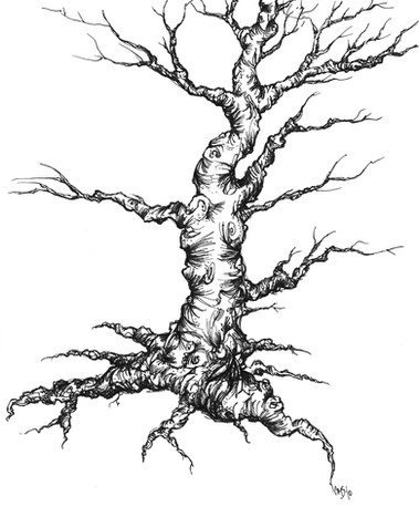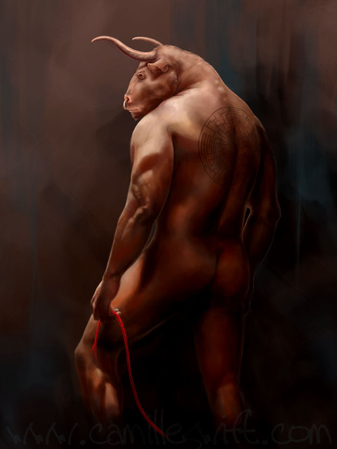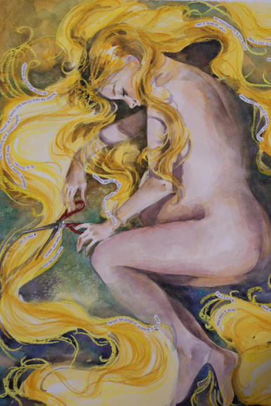 Oil on canvas, 24" x 34"Rapunzel's life is not her own--she is merely the vessel of her proprietors' demands, their dreams, their desires. They imprison Rapunzel and strip her naked. They fetishize her hair, symbol of her virginity. They clutch at her ripe breasts. They clench the promise of her womb between their prying, possessive palms. She sits still and silent in the darkness of her isolation, but in this darkness she will rise.