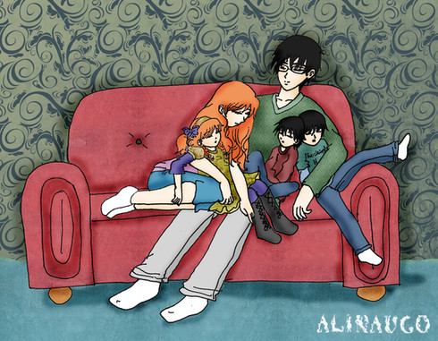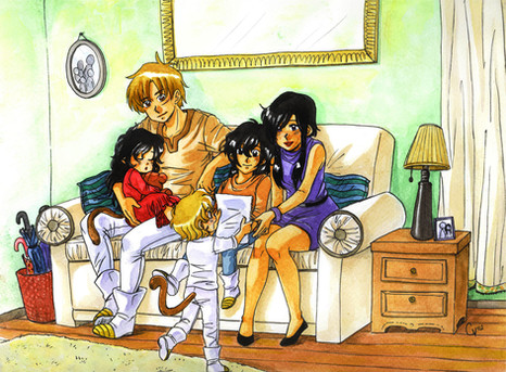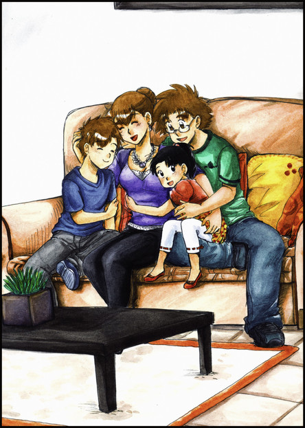 At last! after two weeks I finally finished it >.<I was sketching some doodles of my original characters the Tesa family and I came up with this ones, Here you can see Antonio spending some time with his family; playing tea time with Melisa, fixing Richard's toy car, helping William with his homework and helping Amelia with the dishes :3