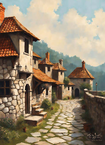 #arched #cobblestone #cobblestones #colorful #digitalartwork #digitialart #illustration #peaceful #sliceoflife #summertime #sunrise #tranquil #village #wallpaper #ideallic #aiartwork