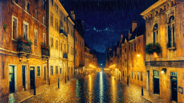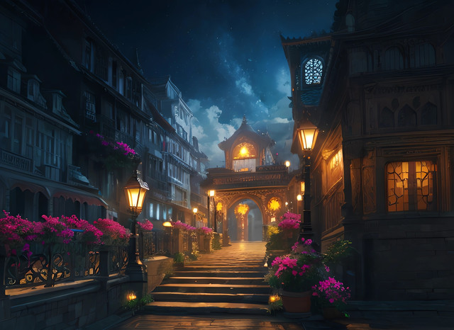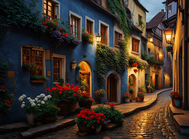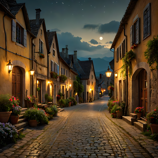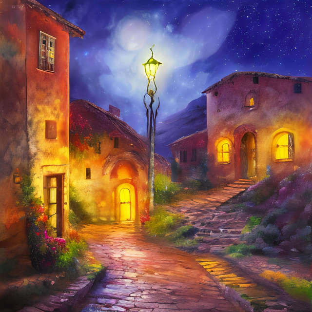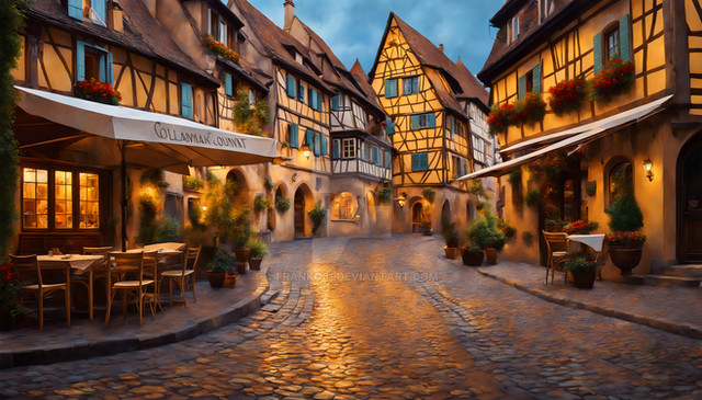 #city #cobblestone #cobblestones #colorful #digitalart #digitalartwork #dusk #illustration #impression #interpretative #peaceful #streetlamps #tranquil #village #wallpaper #cobbled_street #aiartwork