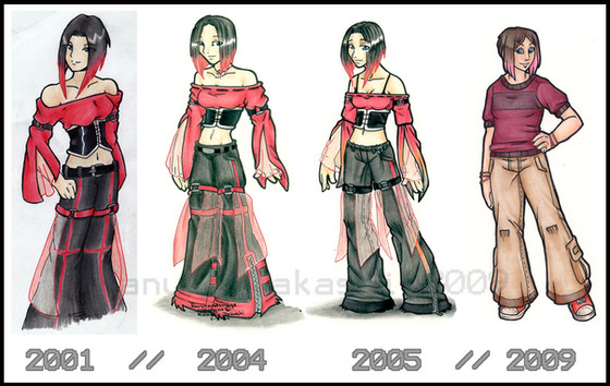 The 2005 image! The improvement is both great and obvious. The lines are smoother, the shapes more defined. For future improvement, I'd say just look at anatomy books...you know those skeleton things some people draw before they add in the details? You could try doing those to make sure everything is in proportion before you go and add the clothes and details, et cetera. Also, I like the coloring on her. And as always, the clothes rock! She's REALLY cute!