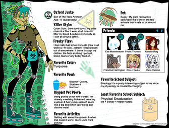 Conner Omegaburst – Age 15 – Son of the brain from Planet Arous Conner is an interesting one. He’s a brain inside of a human body. When he came to this planet him and his father crashed near a morgue and jumped into some bodies to borrow - However What neither of them knew was that if they jump into dead bodies…they get stuck in those bodies. So him and his Father ( who jumped into a womans body funny enough) can’t exactly go home and are working to make a life on earth. Conner is super intelligent and he makes sure he reminds everyone that his IQ is off the charts, He feels aliens are superior not just to humans but to all earth natives and he kind of has a complex about it. He’s kind of a weird mix between Invader Zim and Sheldon Cooper, But he isn’t above learning new things or making friends- if they can put up with him anyways. Fun fact: He has grown very fond of earth music, especially power metal.