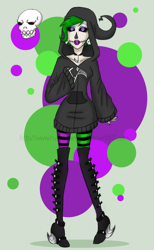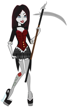 This is gorgeous and stunning work. She is very attractive, too. I really love her profile a lot. She looks like a true grim reaper here. I think it's a combination of her stance, expression, and pose. It's perfect for her. I also like that inside of her cape glitters. The design of her scythe is also nicely done and I like the little wing on it. Excellent composition!