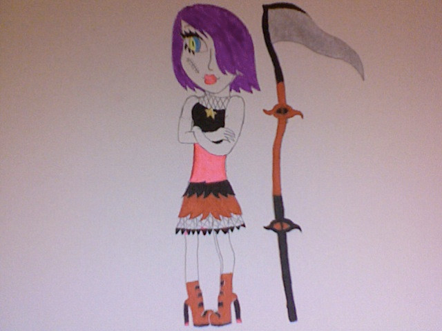 I meant to comment on a picture of her a while ago. I LOVE her design and I think she's an excellent addition to Monster High, from what I've seen of it. I adore her hair colour, and it just looks so beautiful with her skin tone and her outfit is really cute! I love the sparkles on the inside of her cloak. Also, that scythe is all kinds of awesome. I love the addition of the yellow ribbons. <33