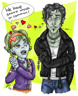 My Entry for DearyEm 's couples contest !Ox and his friend Bonnie on a date! Bonnie like Oxford is a toxic creature, she is immune to many of the things about Ox that can cause physical harm. In her Ox has found a kindred spirit. someone who he can relate too who has a healthy appreciation for his world. Ox lives on a toxic waste site, radioactive community pools, polluted air, debris, etc. All the things that his friends should be exposed to in small doses wouldn't bother her so naturally he bought her home to watch fire works? the stars? poisonous smog gas? chemical spill? burning tire pile? the only limit if your imagination.