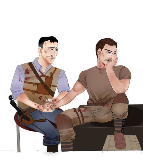 This takes place some time after the hunter ambush that left Gordon’s dominant shoulder seriously injured. He’s healing well enough, and he and Jesse have gotten uncannily good at adapting their communication to rely less on signs incorporating both arms. As mortifying as their brush with danger was, it’s allowed them to get to know each other better and maybe even grow a little closer … even to the point where Gordon refuses medical attention from anyone that isn’t Jesse. Peculiar, really — considering that the clumsy medic still gets his fingers accidentally knotted in the bandages sometimes.
