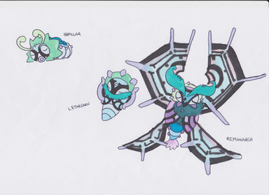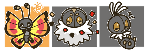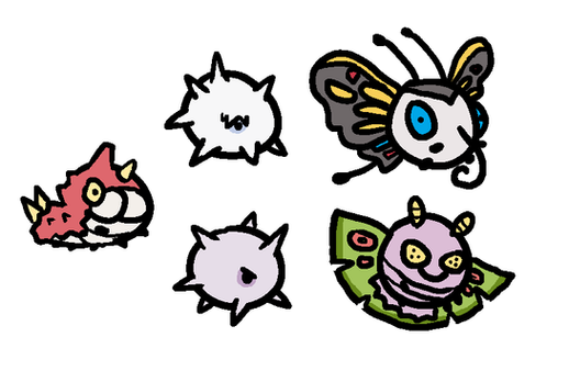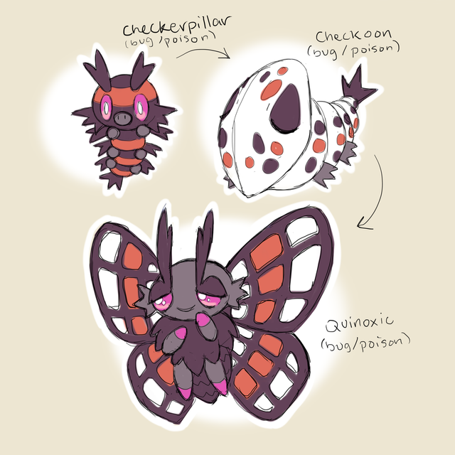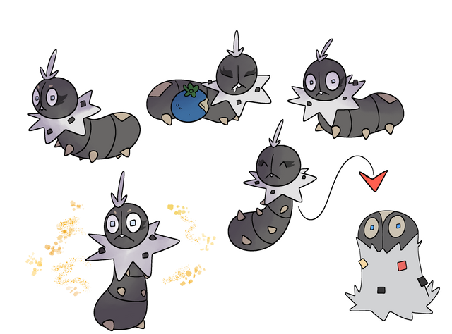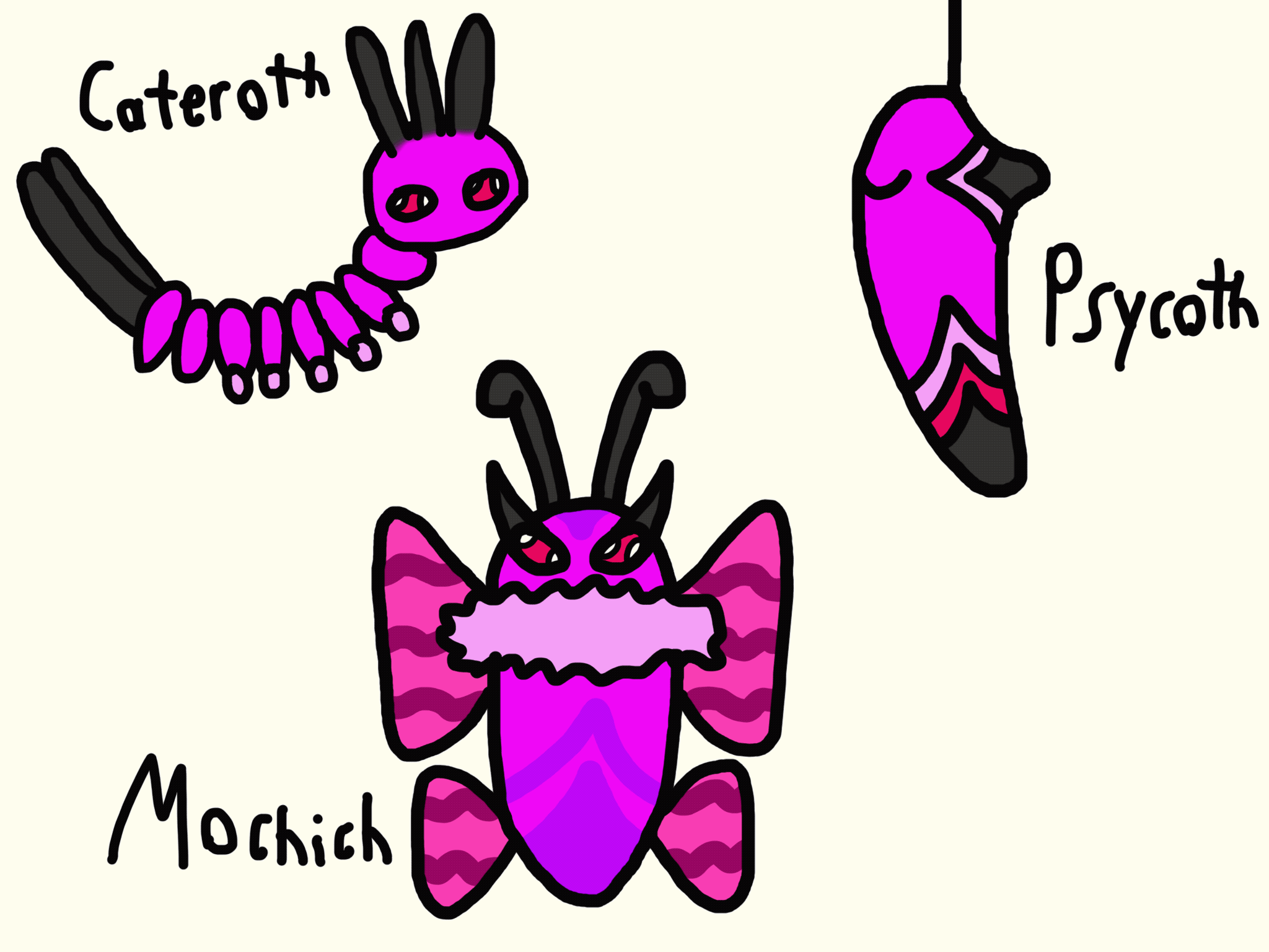 (fakemon I made last year)Caterpillar guy is Nuzzy, cocoon is Snugbug and the moth is Peppow. They're based on the peppered moth and I like them very much