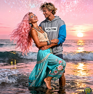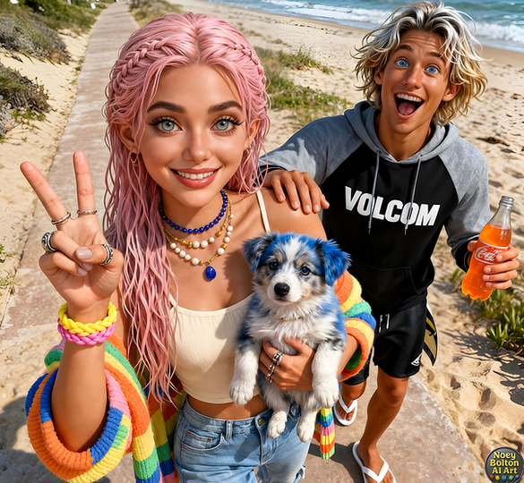 #digitalart #beach #portrait #bohemian #boho #fantasy #pinkhair #puppy #surfer #womanbeautiful #artai #travelart #aiartwork #aiartcommunity