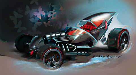 The Batmobile, how many designs, sketches and artwork have been made in all those years? Uncountable i guess...so here is one more.This sketch was made some months ago for the batmobile design contest from Dwayne Vance at the CarDesignfetish website and now got rendered. Used some new rendering techniques with some flashy colors. Also not a usual black Batmobile but Spectraflame bleu, this color would give some spectacular effects at night in Arkham City...