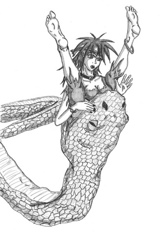The snake is very detailed but the girl, just ruins it all. Her Face is too blurry and why would she be naked, at least she looks naked. But, you're drawing is not that bad.