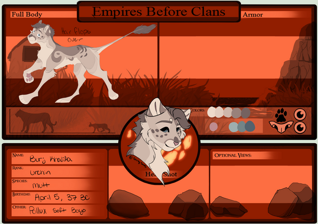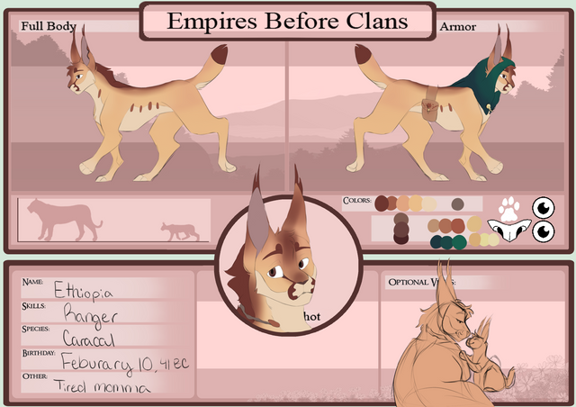 Description: Maple has a slim figure, long legs, and a thick coat, soft to the touch. They have an orange-brown pattern, but the white takes over the majority of the pelt. They have heterochromia, Brown on top and Icy Blue on the bottom of the eyes. Their ears flop over a little, but can hear as if they were fully standing.