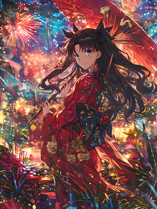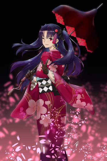 Rin Tohsaka ? But she has blue eyes no ? Her kimono is cute btw.