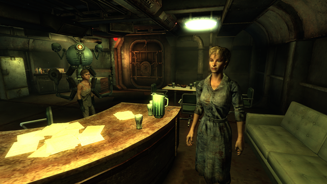 Christine tilts her head slightly, glances at Rhodane's collar, then your Pip-Boy. She opens her mouth, frowns, then closes it. Her face looks sad, and she taps her chest once, slowly. She nods at Rhodane, then the exit.
