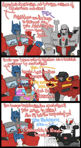 But somehow I’ve worded my artist descriptions in a way that I’ve caused transfans to debate on several occasions whether Transformers are gay/straight/asexual/use a series of tubes. I don’t think I’ve even stated that I care what they are…it’s just the artistic interpretations IN GRAPHIC VECTOR RENDERING that cause your Cappitron’s brain to weep dopamine to ease the pain. I’ve seen the art to prove you’ve taken very concrete stances. The art explaining their lack of crotches (OH STARSCREAM STICK UR PLUG IN MY PORT HOLE) will never, ever leave my mind.