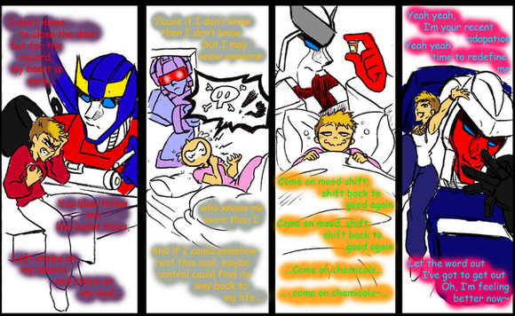 On the subject of your scarring, I will never, ever understand the insane debate of COCKS OR NO COCKS. Seriously. It's probably the dumbest thing to argue about since RIRFIB. I'm heavy in the Transformers slash, especially Beast Wars. YesIadmitit. The way I figure it if a Transformer (ahemBlackarachniaerhem) can have tits out to China then sure, why not, give the dude-bots wangs under there somewhere. Makes as much sense as anything else, and I honestly don't have it in me to argue or really care.