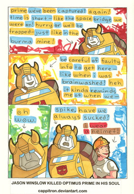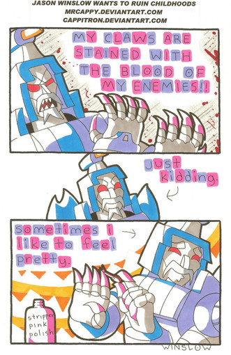 As soon as I wrote the words ‘this’ll be my last Transformers fanart’, I was visited by the Hypocrite Fairy, and he said “Hello Jason/Tard! It shows flexibility to recant a statement you made/You’re a putz and no one will ever love a flakey leaf like you. I’ll grant you more inspiration/I’ll make your soul a never-resting cloud of uncertainty!”