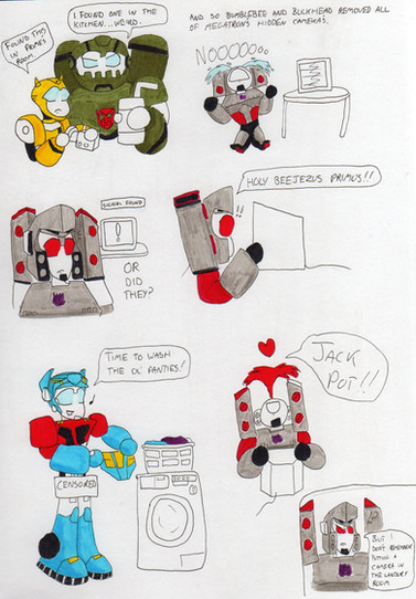 About the art. Remember kiddies, if you’ve never drawn robot chibis before…you may wanna practice on a separate piece of paper! The last panel instead looks like I have serious anatomy issues. But whatever, I now leave to the transfan community the idea of an ‘Auto-Booty’ strip club somewhere on Cybertron.