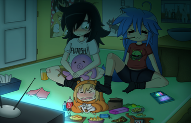 Commission by ZeddyZed for Tomoko, Sadie and Stocking to be eating pizza and playing video games together.This drawing was an absolute blast. I wish I could jump right in and join them!...