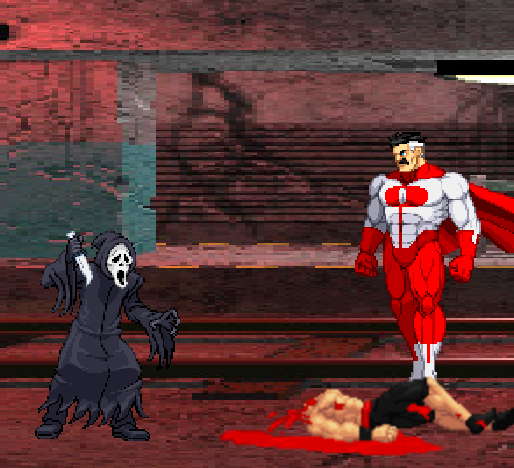 Captain Invincible’s girlfriend have been having little sleep and nightmares as she was being haunted by numerous horror movie villains in her dream. To restore peace to her mind, her dutiful and valorous boyfriend here entered her dream-scape in an attempt to fight off some of her intruding malevolence. There, he find himself burnt by the scorching flames and lava. His girlfriend’s mind has been taken over by a number of horror movies’ antagonists including but not limited to, Freddy Krueger, Predators, and Leatherface.Fighting his innumerable opponents, the Captain found that his “invincibility” (ie. invulnerability and super regeneration) didn’t work as well here as Nemesis from Resident Evil regenerated his broken arm by the Captain, and shot him on his quads which remained bleeding. Ignoring his pain, the Captain fought on further and learnt that his enemies were unaffected by the burning terrain here. In fact, their abilities were augmented somehow whereas the Captain struggled to keep fighting with his injuries and lost blood. Despite acknowledging these disadvantages, he refused to leave his girlfriend’s mind like that and pressed on.