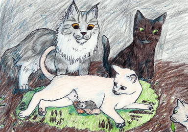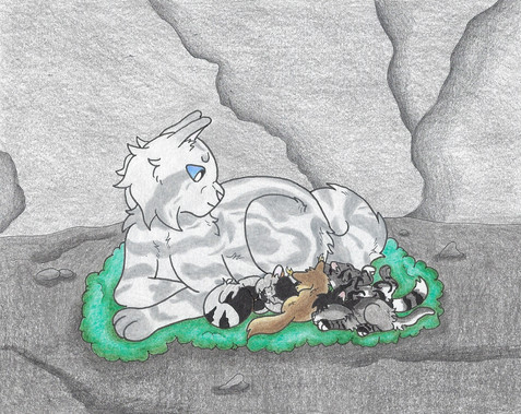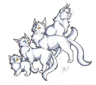 Snowfeather finally gets to return to ThunderClan after she was taken by ShadowClan; they needed her to save a litter of five after their mother died. Two of the ShadowClan kits leave with Snowfeather and they unite with her ThunderClan kits to form a nice little family.Snowfeather - blue point with faint tabby markings