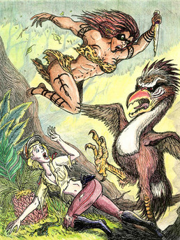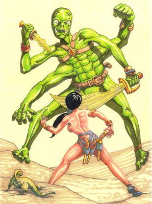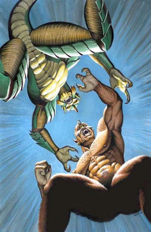 I thought this Swamp Thing-like hero when I was young.The croc-lion beast, I think, is Egyptian-myth based.