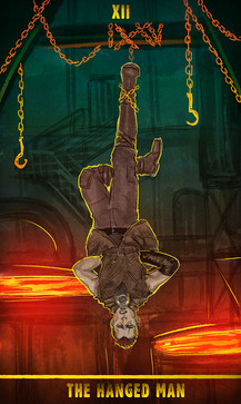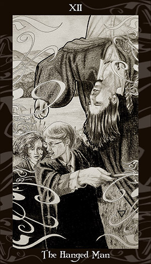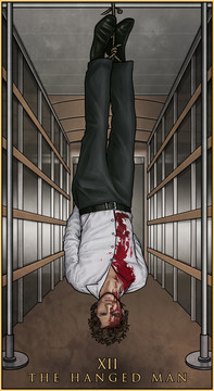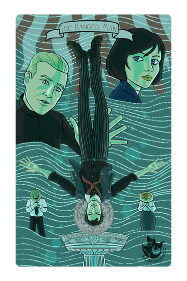 I wanted to keep with the imagery of the card but give it a Supernatural twist. so I used some of the key images from the card it's self, the tree of knowledge, Sam's drawing of the tree outside their house, Enochion symbols in place of the ruins and of course the hanged man himself, Dean. I used Dean from the end of season 1 because for me this was when he started to ask question's that nobody on earth could answer for him.