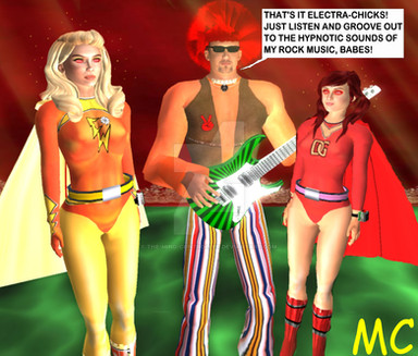 After posted his pictures of Electra Woman and Dyna Girl yesterday, I got inspired to try my hand at it too...So I dug around and dug up the fact that there weren't really too many villains on that show.Still--The Electrafantastic ladies are imperiled by a walking combination between Captain Trips and Captain Eo, Glitter Rock!