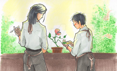 Malfoy turned around slowly,eyes wide,pale face turning slightly pink when he saw Neville standing behind him,an equally pink blush on his cheeks. There was a potted plant in his hands,and the taller Gryffindor raised it in front of him,as if to hide behind it,