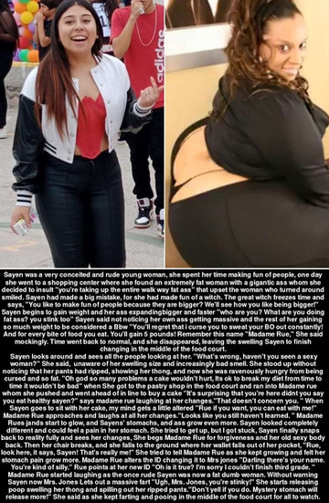 Time flew by as Sayen continued to indulge in the delightful cuisine, and - before she knew it - she had become significantly overweight. Yet Sayen was hardly embarrassed by her overeating, not to mention the attention it had brought her - a product of the magical impulses which drove her to eat so voraciously. Despite her weight gain, she cherished every moment she spent indulging in the food of this very, very special restaurant. She couldn't help but come back every week, to the point that the other patrons started to recognize her, and even began discussing her love of the food with one another. Regardless of her large and growing size, Sayen... or "The Fat Catter", as she was now known... wasn't capable of stopping herself from enjoying the delicious meals the restaurant served, leading to her becoming a local celebrity of sorts. She proudly owned her newfound fame, never stopping her enthusiastic weekly binge.