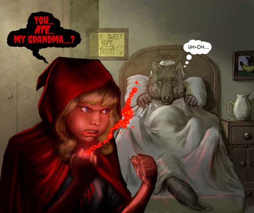 I also love the many details, such as the gory fingernails on Red. Do I see various organs in her little basket?