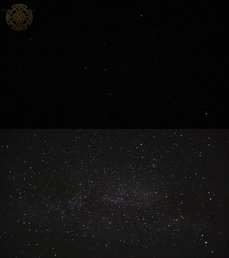 I am often asked if you can really see what I photograph at night with your own eyes. And the answer is sort of Yes and No. The image on the bottom is a good representation of what I can see with my own eyes from where I live which is blessed with really dark skies. I can easily see the Milky Way as a faint band running across the sky and I can make out the dark dust lanes within the Milky Way. Some of the stars are distinctly reddish, yellowish or blueish but for the most part the sky at night to the unaided eye is monochrome. I can even see the zodiacal light on occasion (top right of image streaming to the central bulge of the MW).What the long exposure of a camera does (top image) is bring out the colours of the night sky and makes those faint unaided eye details much brighter and more defined.