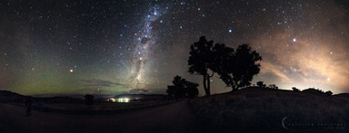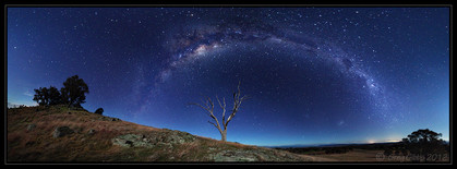 This is the lookout below "The Horn" in the Mount Buffalo National Park. Over 180 degree panorama made from 8 portrait style images. The landscape is being lit by the light of the crescent moon which is the bright spot on the right of this image. Another one of my cameras is in the hut doing a timelapse (coming soon).