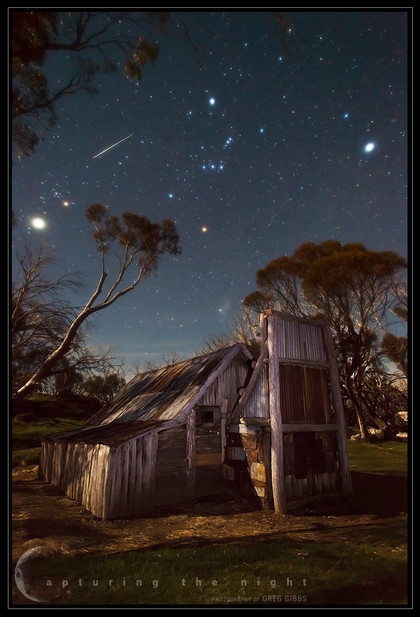 At the top of the image is the Large Magellanic Cloud (LMC) and the Small Magellanic Cloud (SMC) which are dwarf satellite galaxies of our own Milky Way. The LMC is home to the very large star forming region of the Tarantula Nebula (brighter greenish patch). The bright spot just to the right of the SMC is the second largest globular cluster in the night sky 47 Tucanae which contains millions of stars. In the lower section of the image to the left of the hut are Alpha and Beta Centauri, the closest star system to our own Sun. Above that in the Milky Way is the Southern Cross (Crux) Constellation and the dark Coal Sack Nebula. Further along the plane of the Milky Way is the Carina Nebula star forming region.