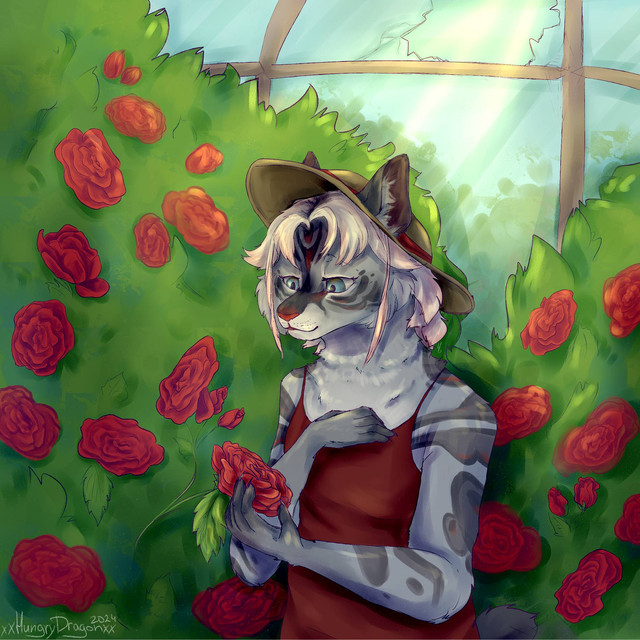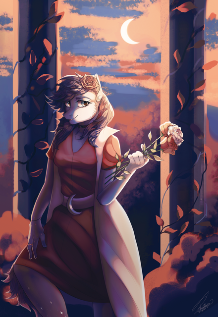 I really enjoy the composition and size/shape of the canvas you used, as well as how you added a sort of glow to the highlighted edges of the roses. The shading on the fabric flows very smoothly, though I feel like the entire outer edge of the characters silhouette could have had a small highlight? Sort of like hot it was on the right-hand edge of her skirt( not stage right, actual right, haha)