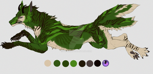 That is really an interesting concept! Makes you a little afraid to get crossed up with that tail.....I like the leaflike markings on its back, and those sharp ears--and that little horn is cool!