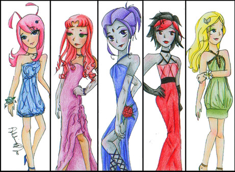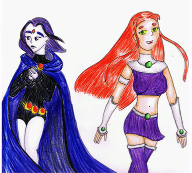 Starfire and Raven as seen in "mother mae-eye"...because drawing Rae-Rae in bright, poofy, OOC clothing is fun. xDcharacters Β© DC Comics & Cartoon Network