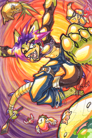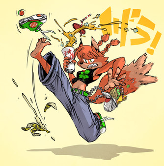 Interesting design and completely unique character~ The lines are smooth, fluid and assist in the process of making the colors pop out. Anatomy is funky, interesting and dynamic. The pose is dynamic as a result of the angle, perspective and the motion captured in the jeans and specks of rice. Colors are attactive and addictive. I think it would help push the shovel out if you gave it a bolder outline or perhaps maybe a small blended black to white or cream outline. Also maybe more pieces of rice in front of her to add to the sense of depth. High Energy and whimsical.