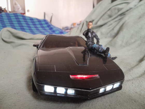 Silly photo and not very good quality ( I just don't know how to get good photos with my phone's camera) but I just wanted to show it cos I love this KITT toy. Always loved him from the original Knight Rider show and I finally got a great toy of him. Just off to the right you can sorta see the Hot Wheels toy of KITT trying to get into shot. The large KITT completely dwarfs him so much that HW KITT could likely turbo boost through the large KITT's windows with plenty of room to spare. Anyways yeah I love this. Has about 10 phrases/sound effects, scanner light, front foglights, rear lights, light up dashboard (and the voice modulator lights up in time to KITT's phrases like he's talking), rubber tyres, and it's even got a flippable license plate that he used in only one episode (as far as I can recall). If I had any issues with it, it's that I kinda wish the doors had 'glass' panels for windows preferable ones you could clip on or take off but hey I'm just getting picky. I love this car.In the driver's seat that's a 3.75 inch Dark Knight Rises Batman (not very articulated but was cheap and it's size fits this and the new Doctor Who range and other similar size figures) and he'll do here til I can custom up a decent Michael Knight likely out of GI Joe parts (currently searching through Joe figure archives looking at what figures would be best to purchase and frankenstein into the Hoff). In passenger seat is one of the various modern figures of Flint from GI Joe.