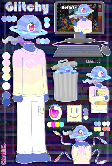 Backstory: Not much is known about Video's origins other than he came from a small, unknown meteor. Surrounded by a rainbow and sparkly aura, people said that the meteor passed through a rainbow which made it slow down a little and have a soft landing, but not after hitting a space satellite. It cracked to reveal a baby alien cat with pastel rainbow hair and a visor-like single eye resting inside. When Video was brought over to Stellar Town, he was adopted by the space creatures.
