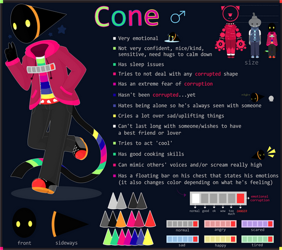 Likes: His phone, memes, music, being part of chat groups, pancakes (his favorite food), fruits/berries, colorful aesthetics, rainbows, pastel or neon colors, dancing, races, adventures, running, video-games, receiving gifts.