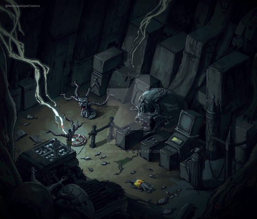 I like the jumble of wires and old technology that's strewn about and enmeshed in the foreground and background. Definitely screams "dystopian" to me XD
