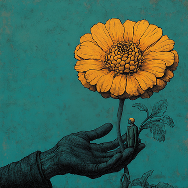 I read your description long after I had collected and viewed this piece of art many times. It has many other meanings for me, but neat to see it was about investments... The style is excellent. The red is love....he's in God's hand.....Or it could be the elder generation in the hands of the youth - red being the risk involved these days with being elderly....the list goes on and on!