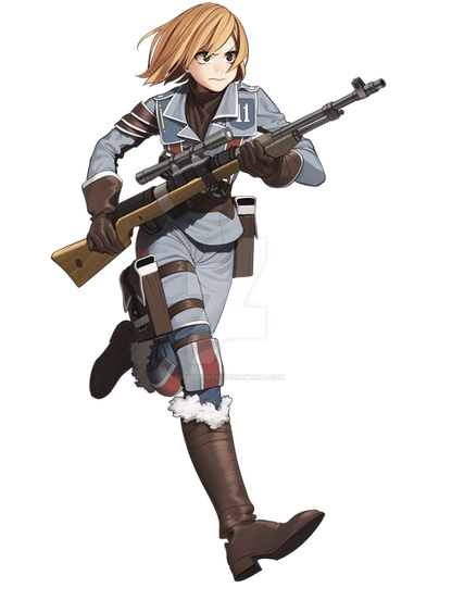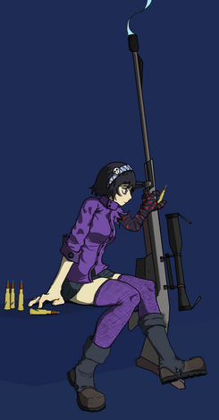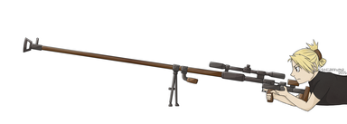 Very nifty. Re: your other comment, if you need a reference I'm sure I could arrange one ^-^ The primary inaccuracy is that the bipod would be angled slightly out toward the muzzle and that she would be hunched forward into the weight of the gun, both for steadiness and so that it doesn't land her flat on her back when it goes off. Straight backs in a sitting position don't work so well with any recoil, plus you shake a lot more. She'd also have her cheek pressed into a rest on the buttstock - snipers need ultimate stability, and having your eye bounce around the crosshairs doesn't really make for a clean shot. Technically if you wanted to be realistic she'd be laying down with a shorter bipod, but the composition gets a lot less compact and shiny x.X