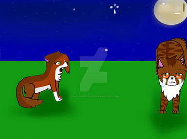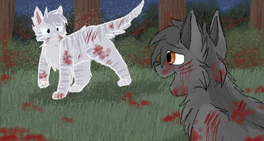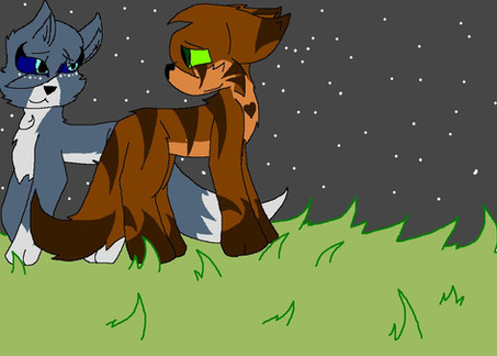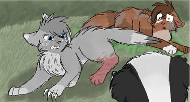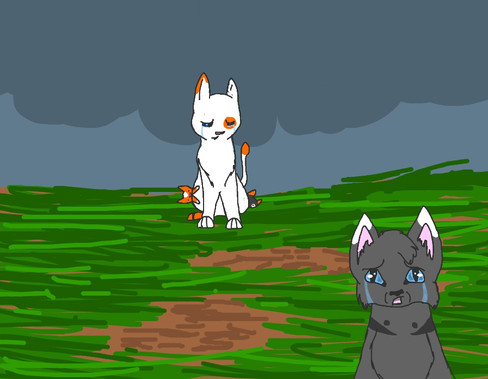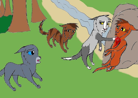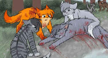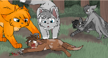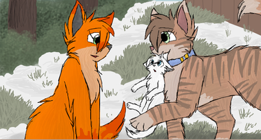 Suddenly, cedarblaze bursts out of a bush and saves stone kit, the fox spat and bit cedarblazes hind leg, he yelped but began to run, holding shocked stone kit. By the scruff, and as the fox ran after them, cedarblaze scrambled up a tree, Β they were safr!